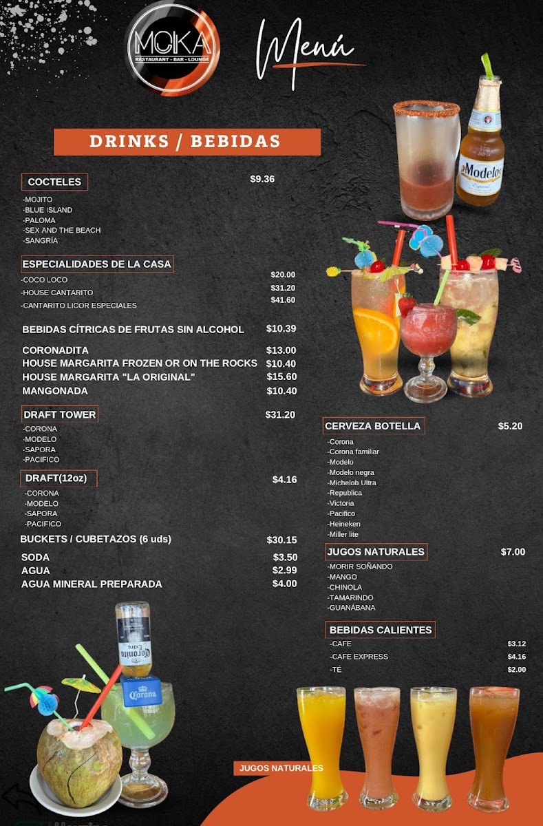 Moka Latin Restaurant and Bar offers a diverse menu that highlights the flavors of Latin American cuisine. For appetizers, guests can enjoy options like Croquetas de Pollo (Chicken Croquettes) and Palitos de Queso (Mozzarella Sticks), perfect for sharing. The sides include Arroz Blanco (White Rice), Tostones (Fried Green Plantain), and Yuca al Mojo (Al Mojo Cassava), providing authentic and hearty additions to any meal. Among the house specialties, the Chivo Campesino (Peasant Goat) and Sancocho Dominicano (Dominican Sancocho) stand out, offering a true taste of traditional Latin flavors. Seafood lovers can indulge in Salmón en Salsa de Chinola (Salmon in Passion Fruit Sauce) or Camarones al Coco (Coconut Shrimp). For those craving chicken, the menu features a variety of options, including Pechuga a la Plancha (Grilled Breast) and the indulgent Pechuga Cordon Bleu. The kids’ menu offers simpler choices like Tiras de Pollo (Chicken Tenders) and Nuggets de Pollo (Chicken Nuggets). For a lighter bite, the Ensalada de la Casa (House Salad) is a fresh choice. The lunch menu, available Monday to Friday from 11 am to 6 pm, includes comforting dishes such as Pollo Guisado (Chicken Stew) and Masita Guisada Cerdo (Stewed Pork Tenderloin). Pair any of these with a refreshing drink, like Gatorade or Yoohoo, or savor a traditional Ceviche Mixto (Mixed Ceviche) for a true Ecuadorian delicacy. The sauces, including Salsa de Chinola (Passion Fruit Sauce) and Salsa de la Casa (House Cream), perfectly complement these dishes, rounding off the bold and vibrant offerings at Moka Latin.